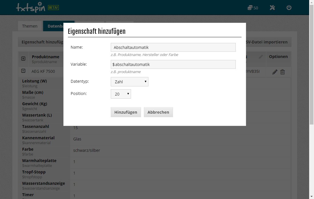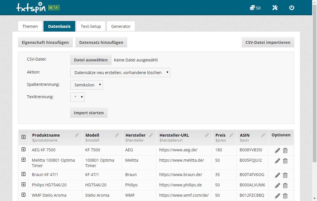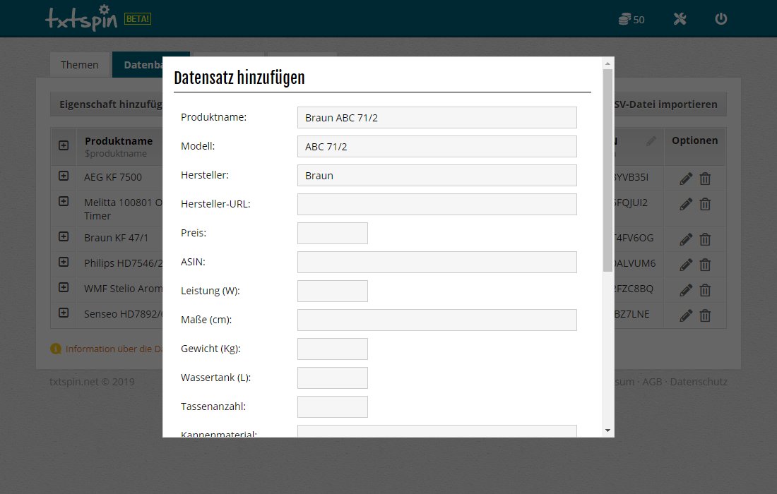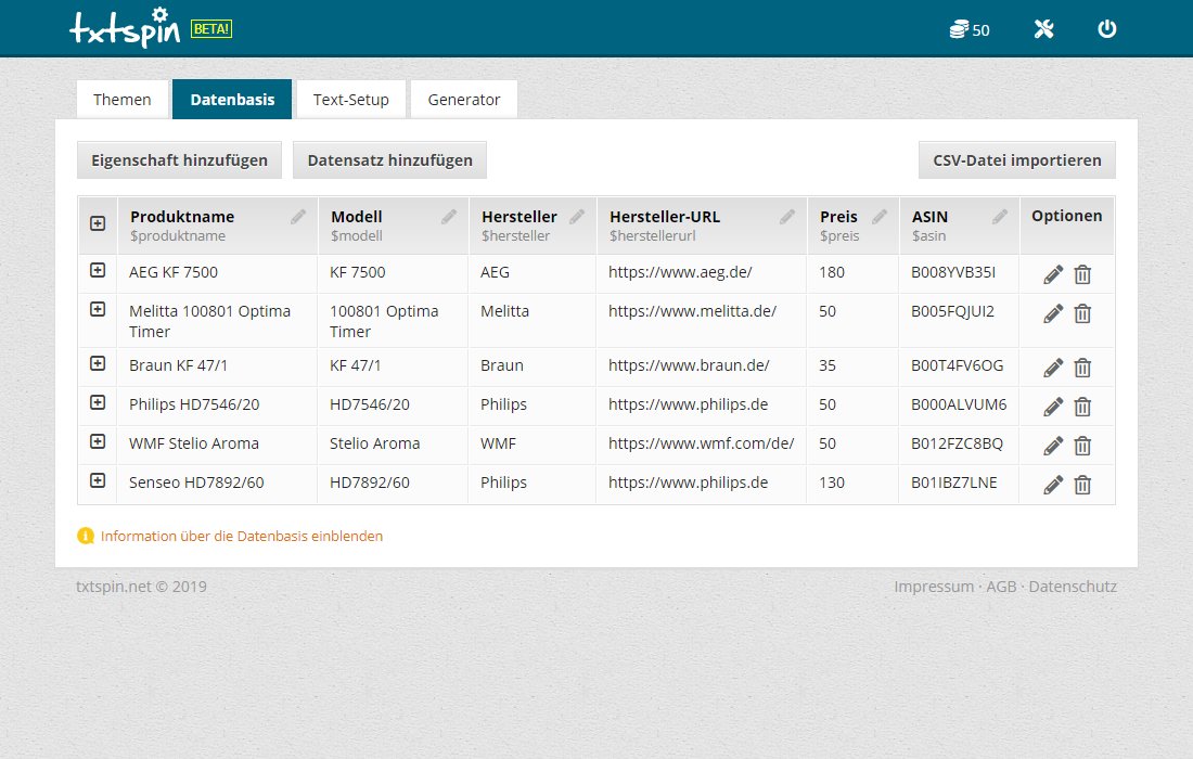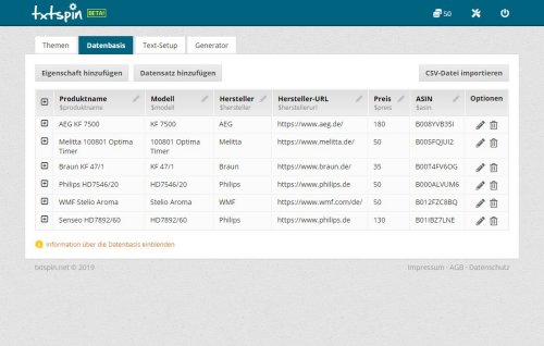 Wenn Du als Inhaber eines Online-Shops über eine größere Anzahl an Produkten innerhalb einer oder mehrerer Produktgruppen verfügst, ist txtspin.net die optimale Lösung für Dich.