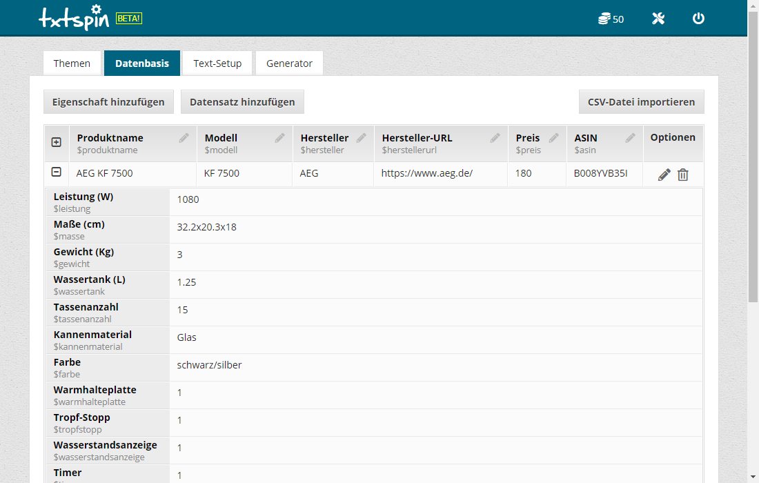 Das heißt für 50 Datensätze (z.B. 50 Produkte) werden 50 Texte mit nur einem Knopfdruck generiert. - Jeder einzelne Text wird einzigartig & hochwertig durch definierte Varianten, Bedingungen & Variablen auf Grundlage der Datenbasis generiert (siehe variantengetriebene Textgenerierung)