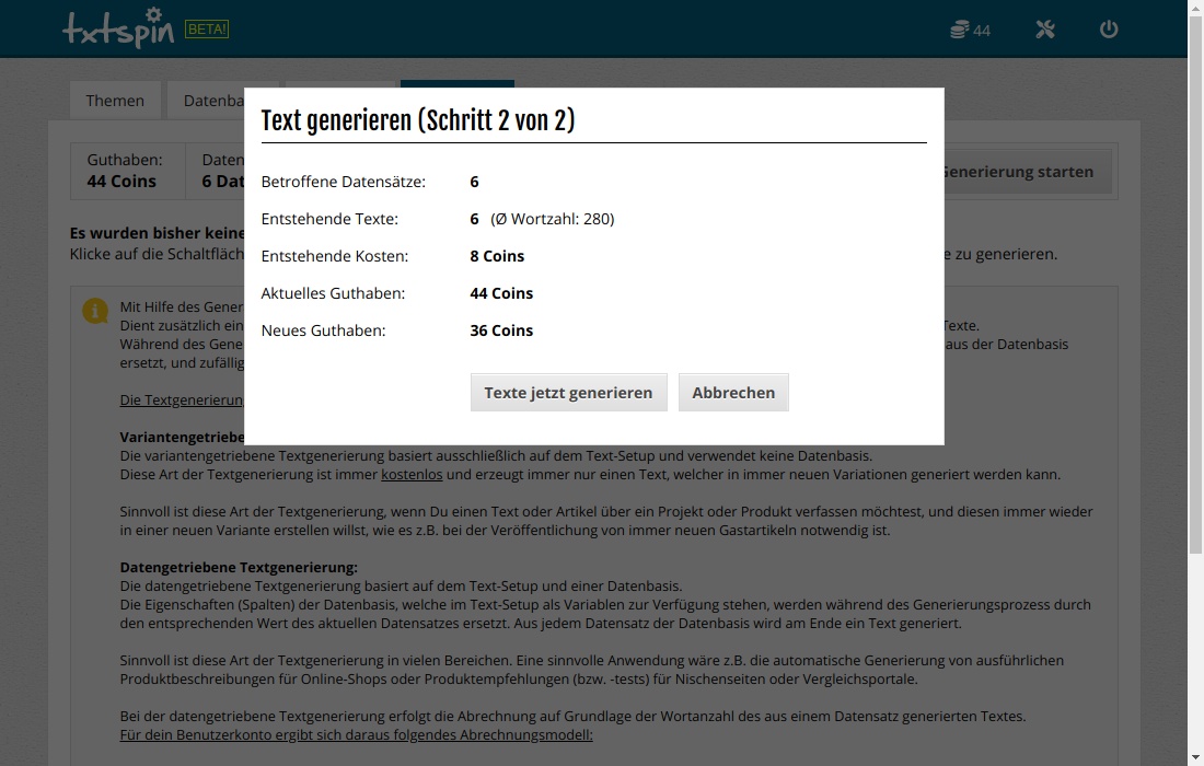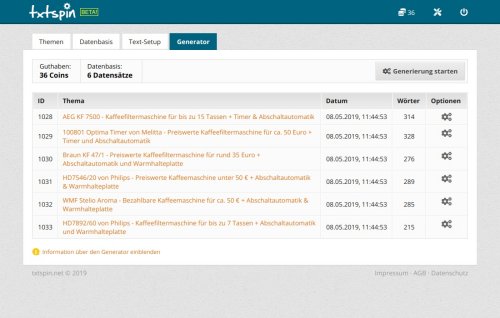 - Die datengetriebene Textgenerierung ist zwar nicht kostenlos, aber für jeden bezahlbar! Bezahlt wird nur für jeden einzelnen generierten Text, ansonsten entstehen keine weiteren Kosten. txtspin soll nicht nur für große Unternehmen nutzbar sein, sondern auch für Kleinunternehmer und Hobby-Webmaster.