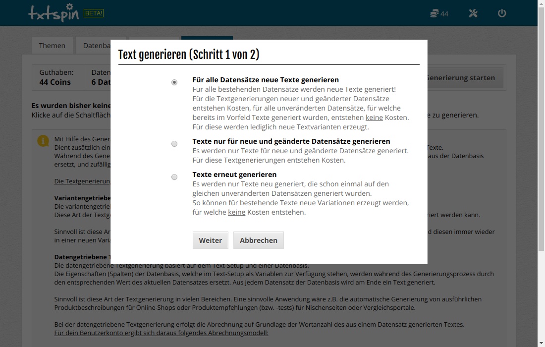 Die variantengetriebene Textgenerierung erfordert keine Datenbasis und ist immer kostenlos!