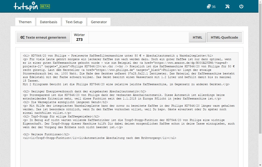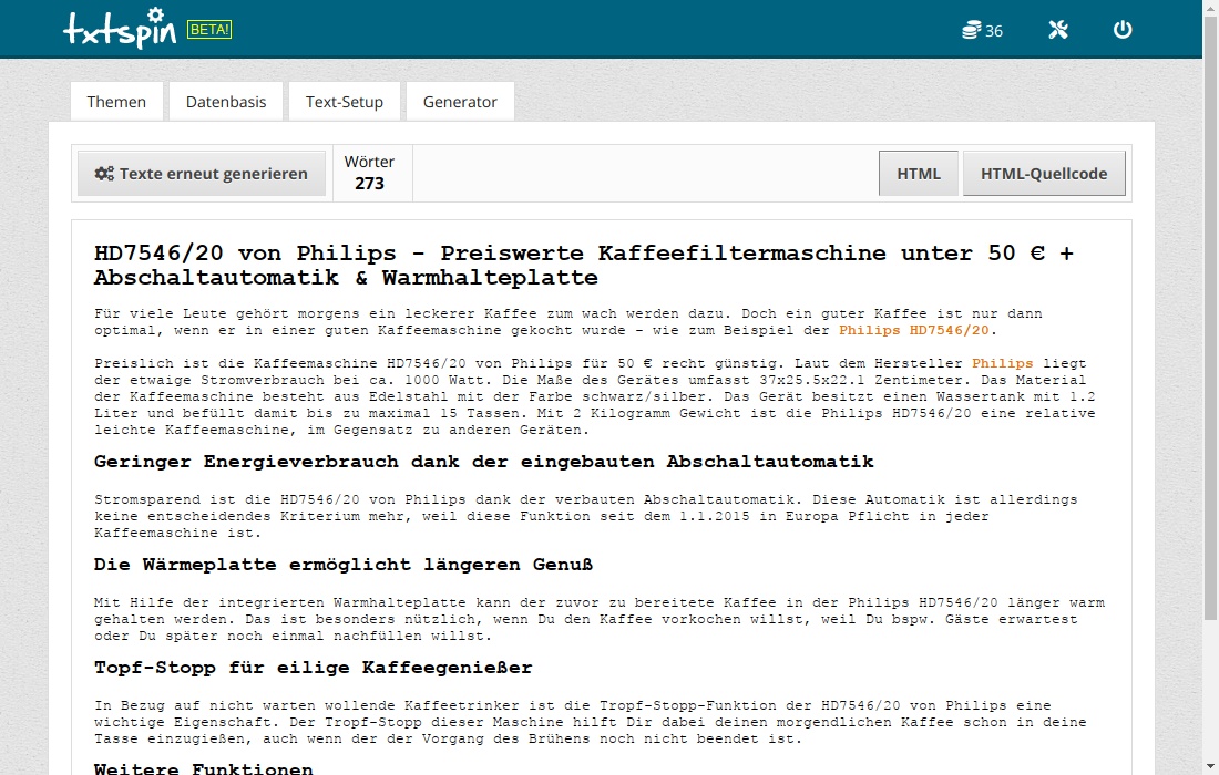 Das folgende Beispiel zeigt einen generierten Marketing-Text für txtspin.net.