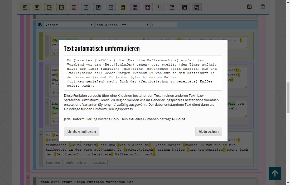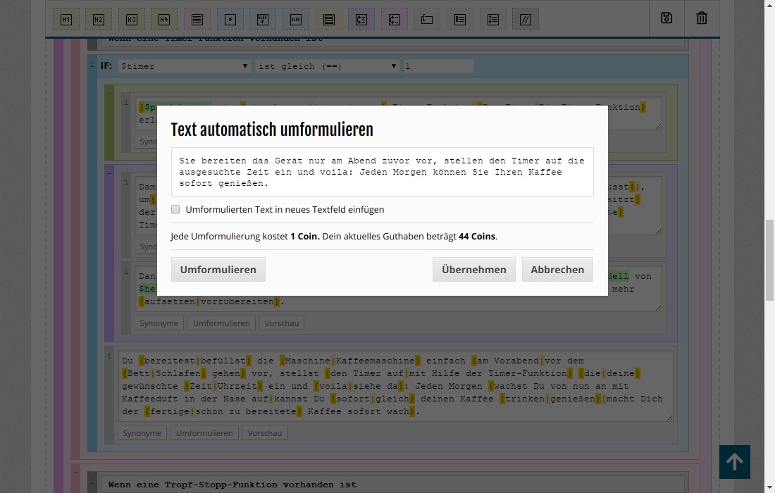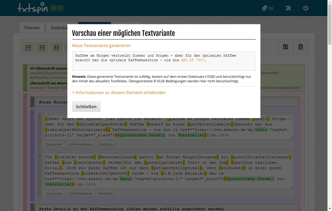 txtspin stellt für dieses Problem die optimale Lösung dar, vor allem weil Sie auch noch kostenlos ist! Mit Hilfe von Varianten, Bedingungen und Zufallselementen kann in txtspin ein Text-Setup erstellt werden, welches immer wieder neue Markting-Texte für ein Produkt oder Projekt generiert.