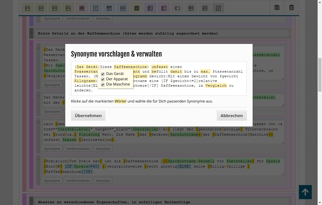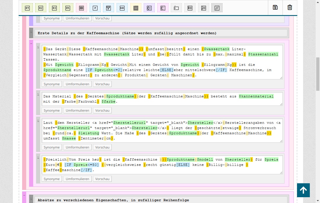 - Varianten: Mit Hilfe das Spintax-Syntax können verschiedene Textvarianten, z.B. durch Synonyme oder Umformulierungen, definiert werden. Während des Generierungsprozess werden diese Varianten dann zufällig ausgewählt. Größe Varianten können mit Hilfe der Zufallselemente definiert werden.