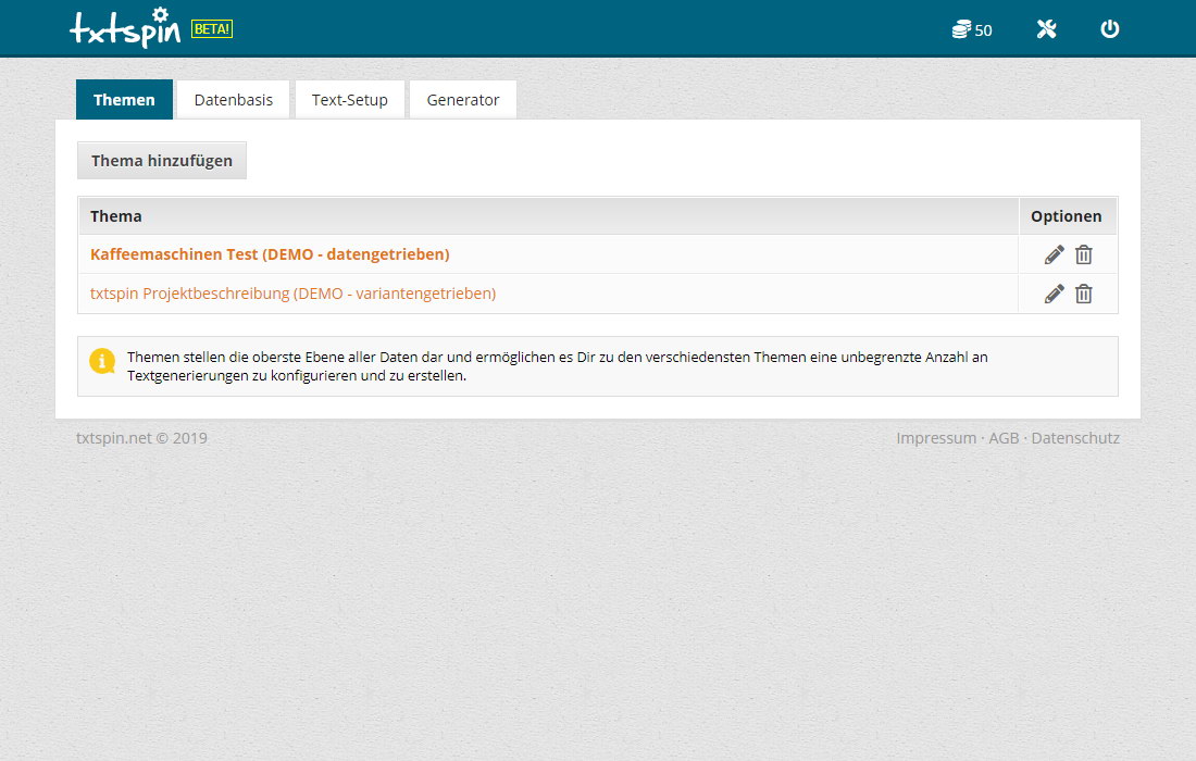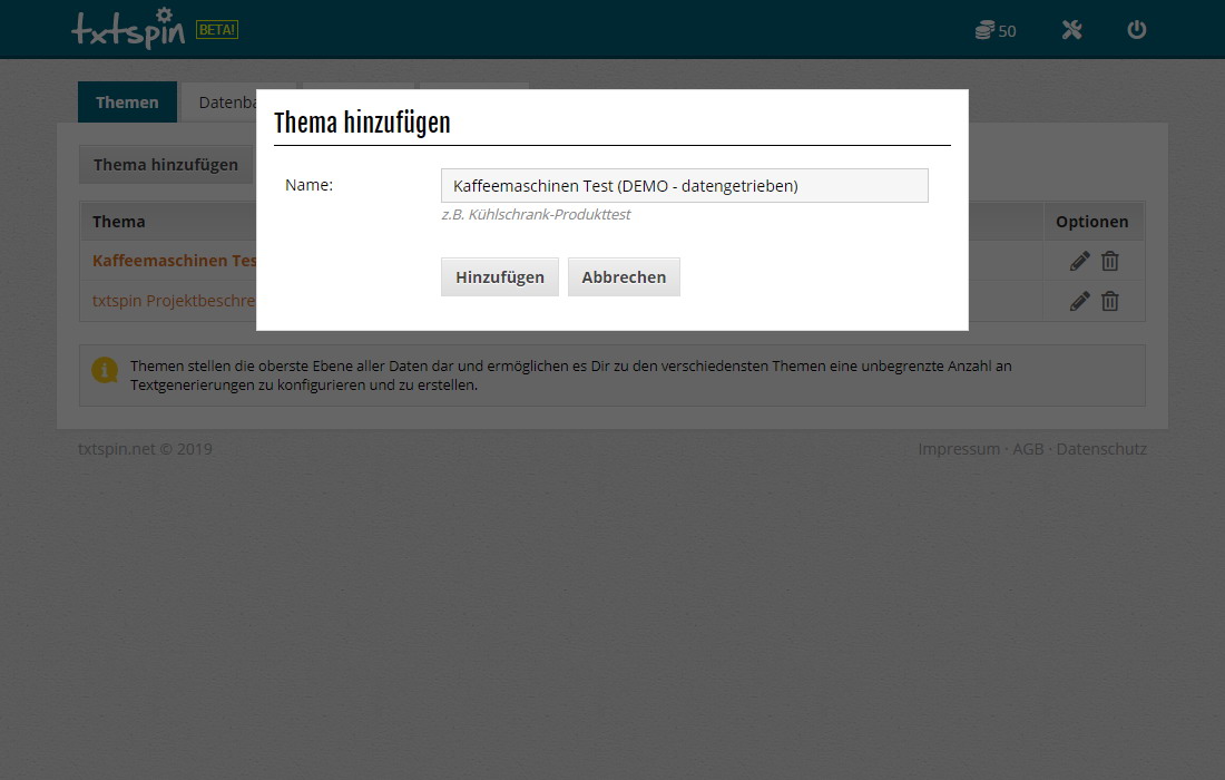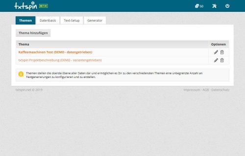 Alles beginnt mit der Erstellung eines Themas. Themen ermöglichen Dir somit unzählige Textgenerierungen zu den verschiedensten Themen.